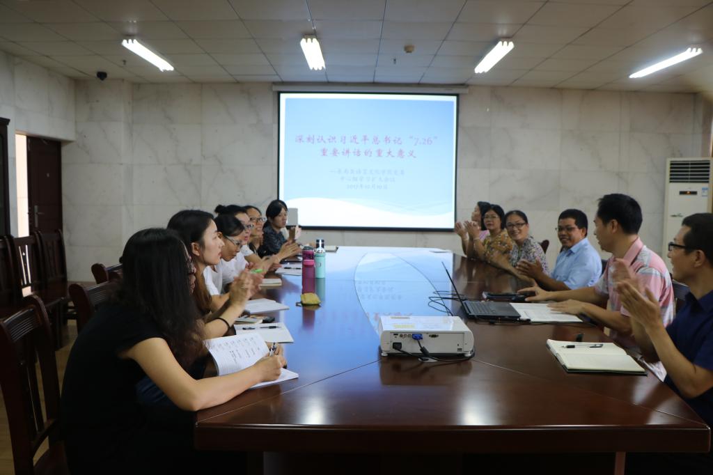 10月10日下午,东南亚语言文化bt365官网网址在国际教育综合大楼308会议室举行党委中心组扩大会议,深入学习习近平总书记“7·26”重要讲话精神。会议由党委书记何波主讲,吴大为副书记主持。