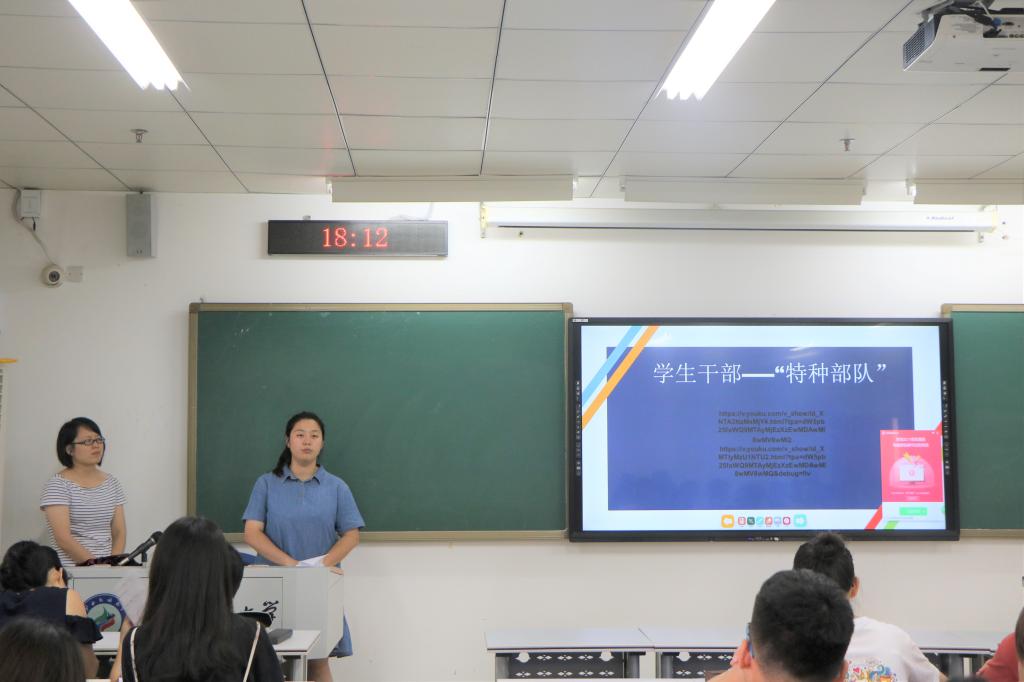 陈婷老师在会议上对全体学生干部进行了第一次集体培训。她以“学生干部——‘特种部队’”为题,从学生组织的定位、学生干部的身份、学生干部应具备的素质和学生干部的转变四个方面向全体学生干部阐述了一支“特别能吃苦、特别优秀和没有享受任何‘特殊’”的队伍建构。“先学生,后干部”,她要求学生干部要广泛联系学生群体,了解学生群体,帮助和服务学生群体,并树立榜样,做好表率。在团学的发展问题上,陈婷老师说,希望学生干部们思想上理解同学,学习上共同进步,提高团体工作的效率,提升整体的综合能力。她借用廖安平副书记提出的“学生会组织要提高政治站位,正确认识自身定位”这一观点,再三强调,学生干部必须牢固树立“四个意识”,坚定“四个自信”,强化自我教育、自我管理、自我服务、自我监督的职能,更有政治担当,更有奉献精神,塑造一支政治合格、学习优秀、品德良好、作风过硬、同学拥护的优秀学生干部队伍。