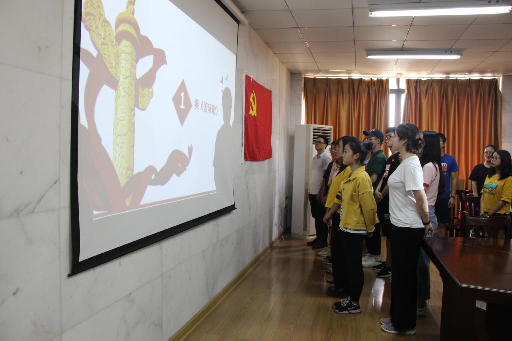 伴随着《国际歌》,新发展的预备党员在党旗面前庄严宣誓,誓为共产主义事业奋斗终身。