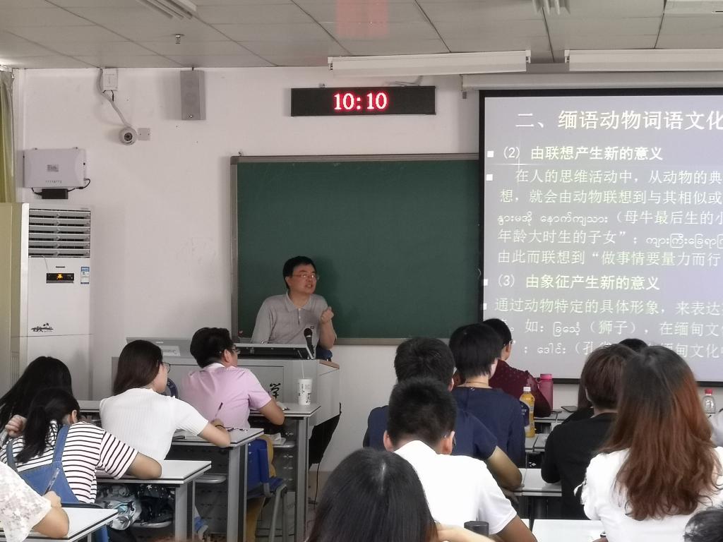 在对“动物,宗教与缅甸文化”的讲解中,钟教授先从“文化”一词的定义、起源、分类等内容讲起,再引入动物、宗教与缅甸文化的由来以及产生原因,以解释三者之间的联系。接着,钟教授结合缅汉语言动物词语文化内涵的异同及之间的文化差异,向大家解释了这些词语的产生、用途及方式。最后,钟教授就缅汉语言中动物词语的文化内涵进行了总结,并鼓励大家在学习这些语言时要先对词语在两国间的文化内涵进行对比分析,深入理解其所蕴含的文化意义,做到“知其言,晓其意”。
