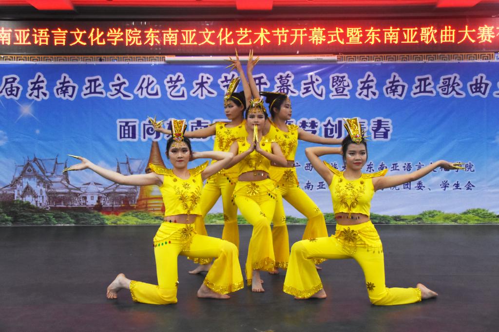 优雅华贵的泰国舞蹈《稻香园》拉开文化艺术节序幕。少女们身着金色的泰国服饰,头戴宝塔形金冠,伴着婉转动听的音乐,用婀娜的舞姿演绎别具风情的泰国传统舞蹈。在八国传统服装走秀节目中,学生身着中国、越南语、泰国、老挝、缅甸等八国的特色服装,展示八国问候礼仪风采,让观众近距离感受中国与东南亚国家风情。学生们还用七国语言演唱《带你去旅行》,充满异域韵味的歌声博得观众阵阵掌声。